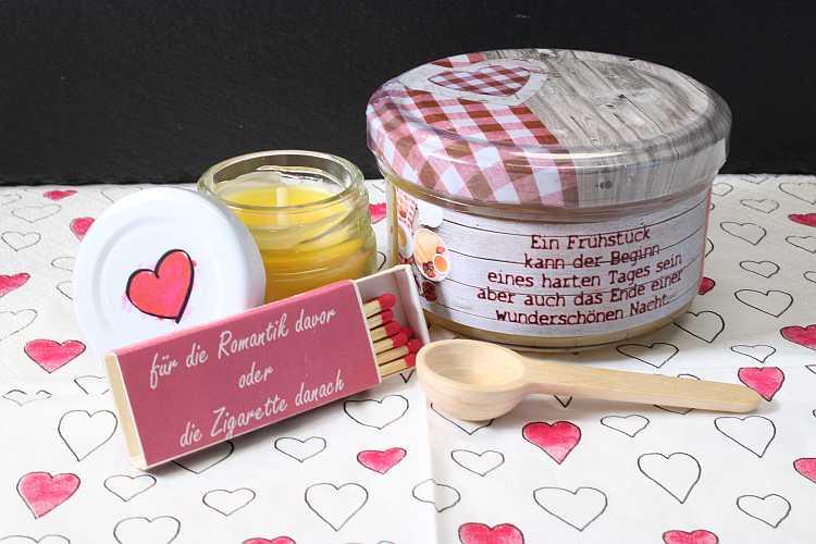 Für ein Frühstück zu zweit. Mit einem Glas leckeren Honig, einer süßen kleinen Kerze und etwas Fantasie starten Sie nach einer wunderbaren Nacht in einen wunderschönen Tag.